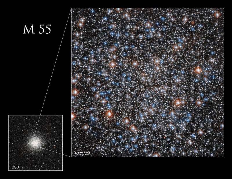 Though this image shows just a portion of M55, the cluster as a whole appears spherical because the stars’ intense gravitational attraction pulls them together. Hubble’s clear view above Earth’s atmosphere resolves individual stars in this cluster. Ground-based telescopes can also resolve individual stars in M55, but fewer stars are visible.