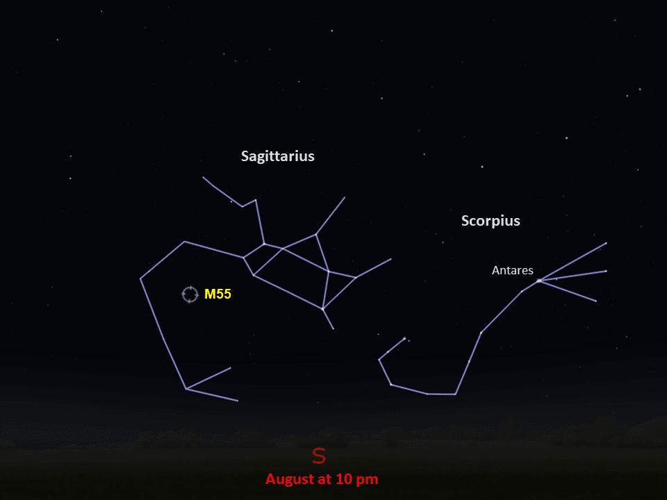 For northern observers M55 sits low in the sky, so the view is hampered by a thicker layer of atmosphere, as well as water vapor and light pollution. This hindered Messier’s view from his Paris observatory. When he cataloged it, Messier noted that “its light is even and does not appear to contain any star.”