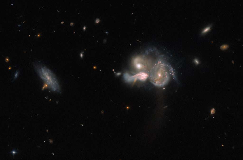 A spectacular trio of merging galaxies in the constellation Boötes takes center stage in this image from the NASA/ESA Hubble Space Telescope. These three galaxies are set on a collision course and will eventually merge into a single larger galaxy, distorting one another’s spiral structure through mutual gravitational interaction in the process. An unrelated foreground galaxy appears to float serenely near this scene, and the smudged shapes of much more distant galaxies are visible in the background.