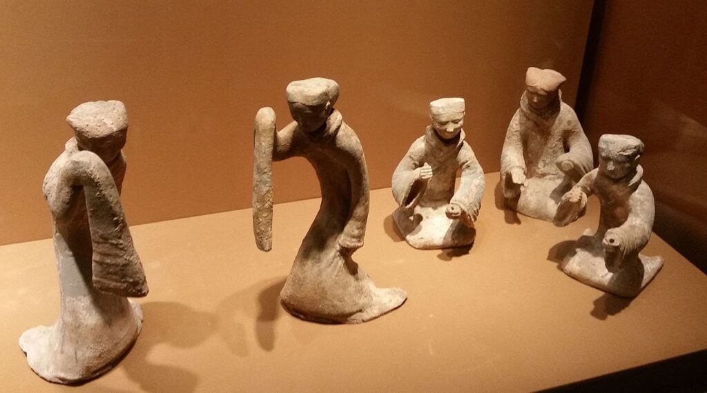 Han portrait stone (stone murals that Han Dynasty people carved on the four walls of the tomb and shrine as decoration) also appealed to the “dance to belong” ceremonial dance. On the Han portrait stone unearthed in Pengxian, Sichuan, the master wears a crown, wide robes, and wide-sleeved sleeves, the sleeves and sets of narrow long-sleeved, colorful edging, the right hand raised, the left hand for the invitation, the guest is also a long robe and wide-sleeved, raising the right hand, the left hand forward to answer the dance. Female attendants next to the master, holding a fan, and male attendants next to the guest, holding a long table and preparing to serve wine and food. In addition, there is also a chain of image dances.